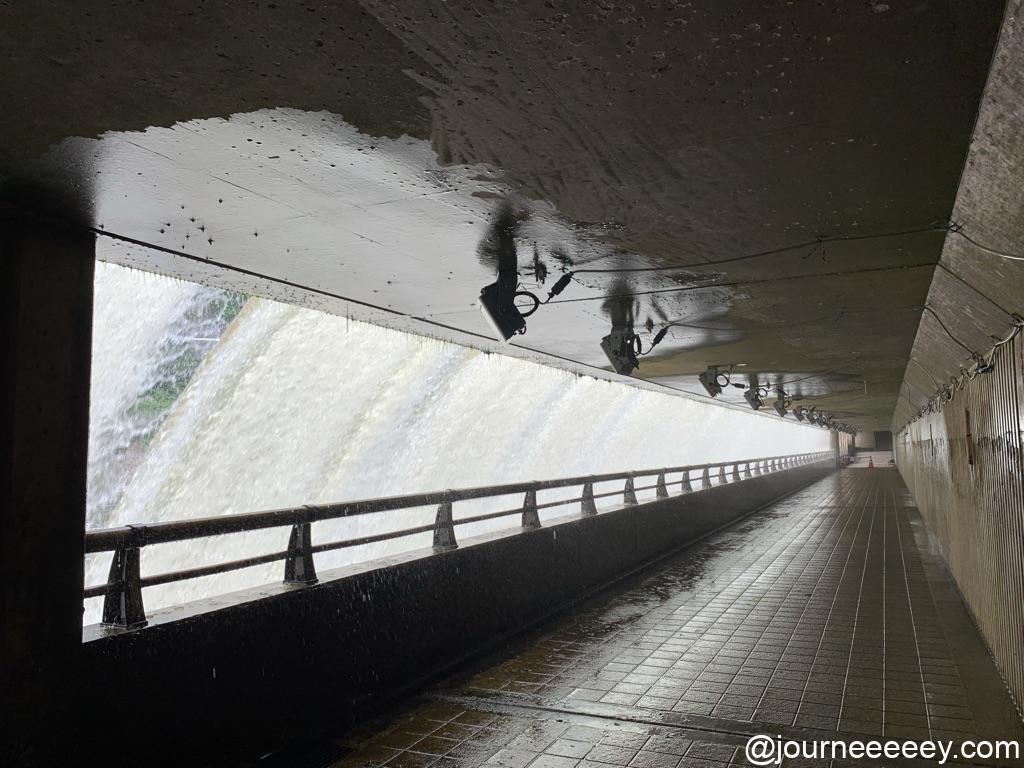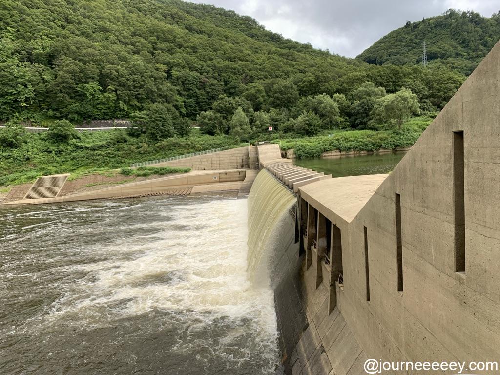夏の間は湯田ダムの水位が下がるため、錦秋湖大滝(貯砂ダム)が見れます。滝の下に入れるのがおもしろい。