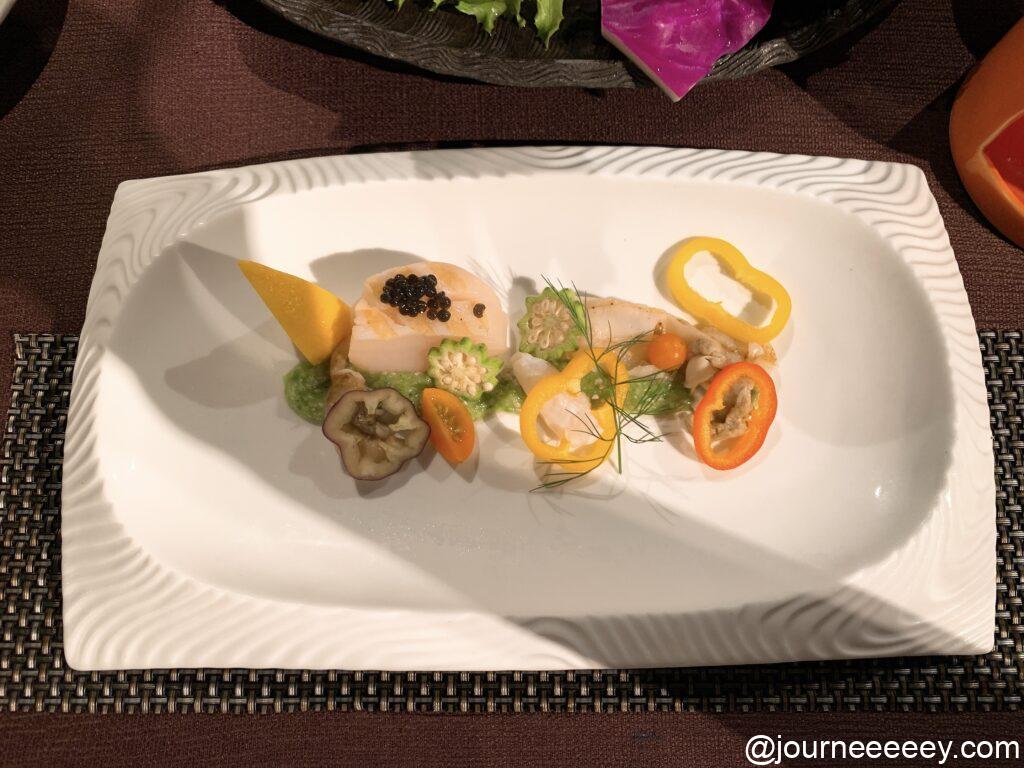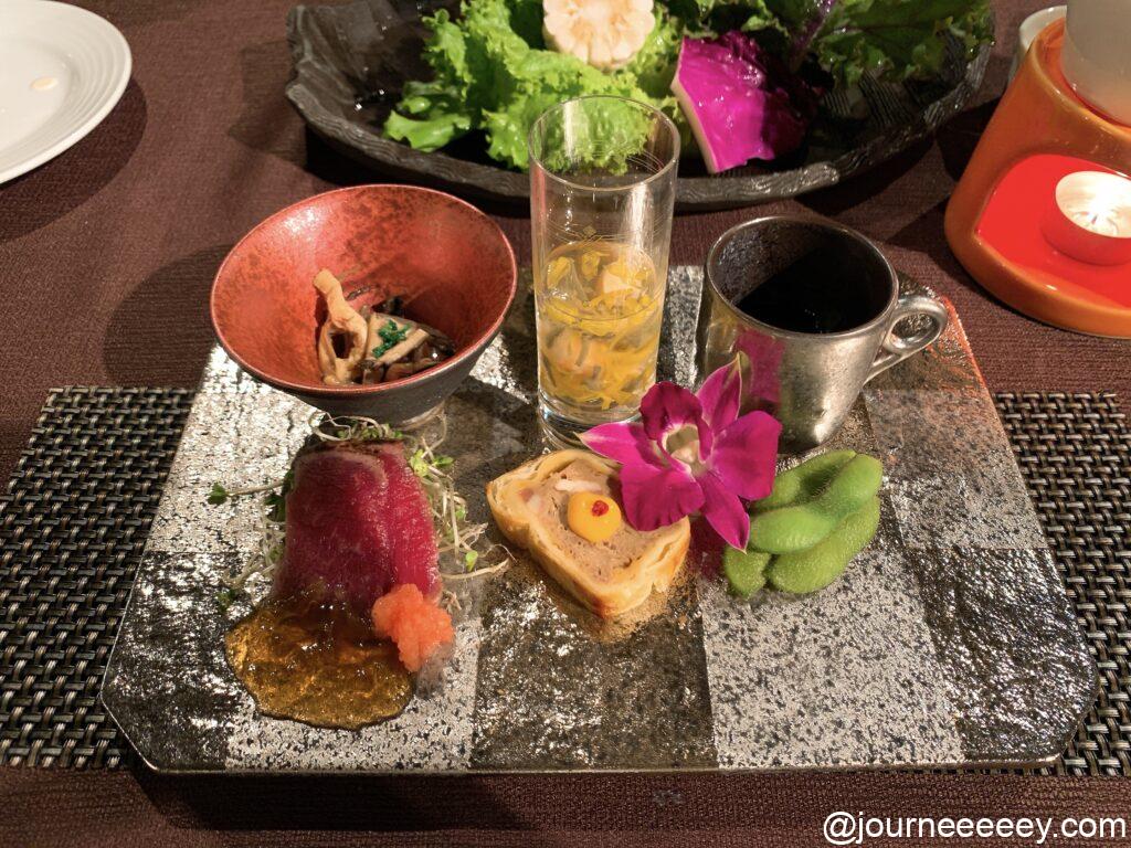 料理は地元・西和賀町の旬の食材を使った創作会席。地元の新鮮野菜をつかったバーニャカウダ(特製ソースが信じられないくらいおいしい)や西和賀町山人ファーム産の南部かしわなどが登場。どれも繊細でうつくしい盛り付けで一品一品がたのしい。
