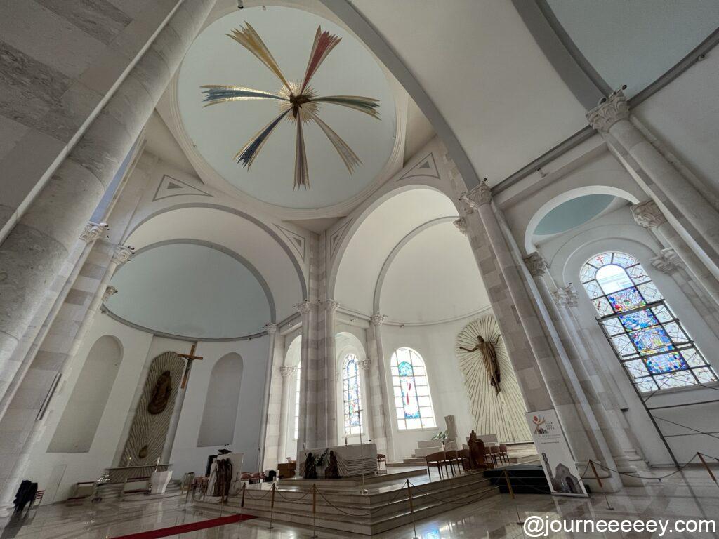 コソボ出身のマザー・テレサを記念した大聖堂で、白と青のうつくしい建築が特徴。