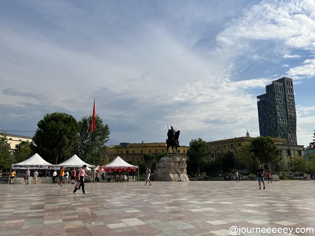 まず訪れたのはスカンデルベグ広場。ティラナのシンボル的な場所で、広場の中心にはアルバニアの英雄スカンデルベグの騎馬像がそびえ立っています。