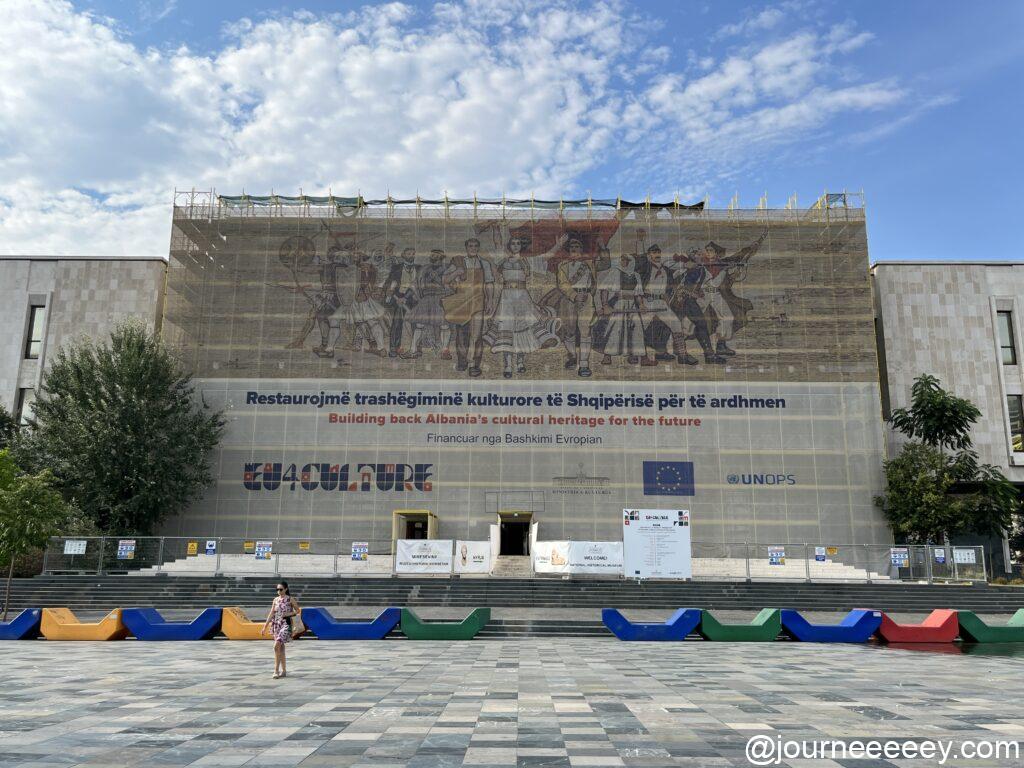 スカンデルベク広場にある国立歴史博物館へ。チケットは1人500レク。アルバニアの歴史を古代から現代まで学ぶことができる博物館なのですが、何度あくびをしたか分からないくらいつまらない。地震がなんか来た日には全て壊れてしまいそうなくらい雑な展示に驚かされます。しかも真夏なのに冷房がなく、ところどころ大きい扇風機から来る風もぬるく、しんどいほどに暑い。ただ2022年8月現在、工事中・メンテナンス中のようなので今後に期待です。