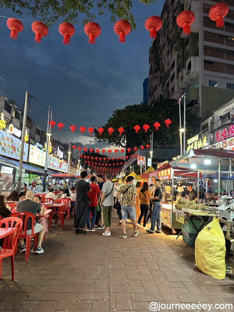 Jalan Alor Food Streetにて、マレーシア料理を満喫!明かりの点った屋台においしそうな料理、地元の人や観光客が集まり、とても活気にあふれています。