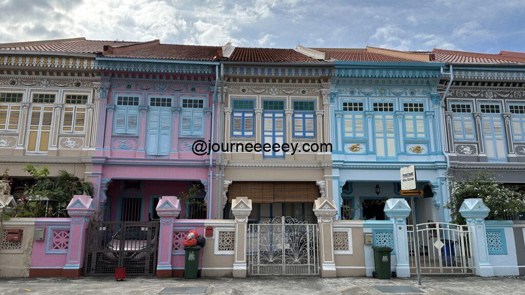 カトン地区のプラナカンハウスへ。パステルカラーのうつくしい家々が並ぶ光景は、写真スポットとして大人気。カトン地区では 雑貨店やカフェで独特のプラナカン文化に触れられます。