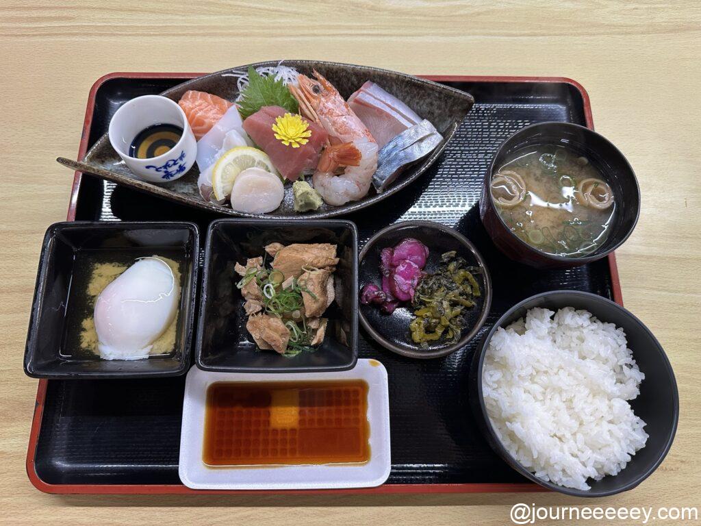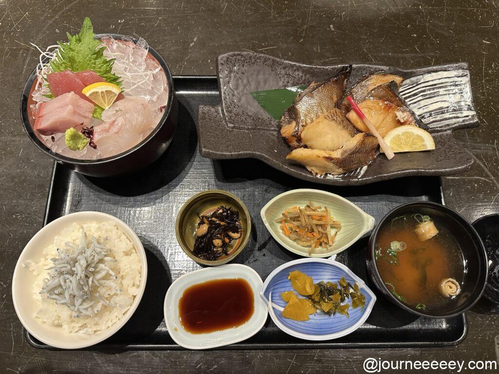 海沿いの海鮮料理屋さんで夜ごはんに焼き魚定食を食べました。焼き魚はしっかり味が濃く、刺身もコリっとしていてよかったです。ごはんにシラスまでのっているのがちょっとうれしい◎ 定食にしては2,000円と少しお高いですが、海と夕日が見える絶好のロケーションでゆったりと静かな時間が過ごせて満足です。