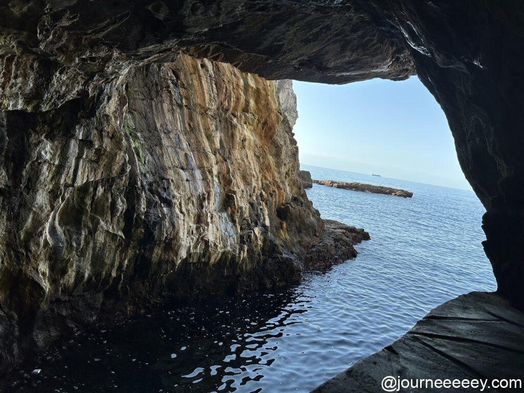 入場料1,500円で海面の高さにある洞窟までエレベーターでかんたんに降りられます。昔、水軍が船を隠すのに使ったという奥深い洞窟には波が打ち寄せて迫力満点。1周200メートル、15分ほどでまわれます。