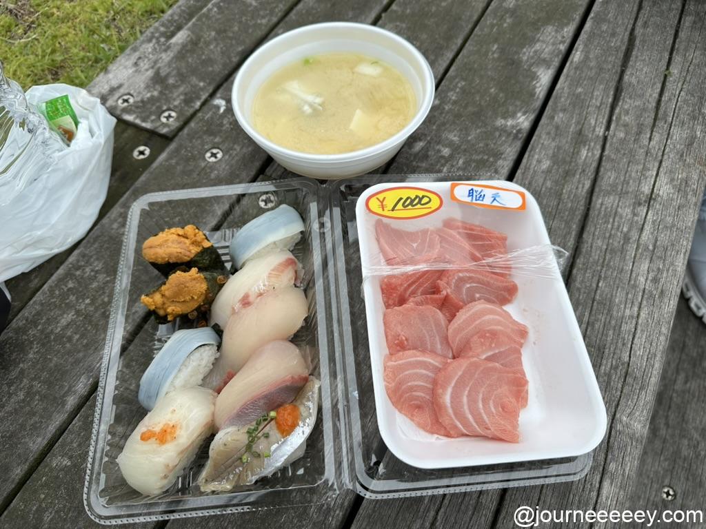 朝イチで下関の唐戸市場へ。市場でお寿司や汁物を買って、デッキのところで食べました。