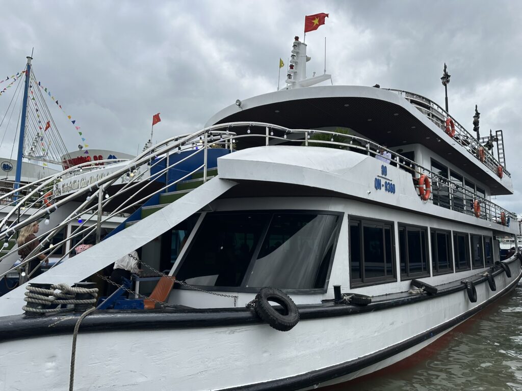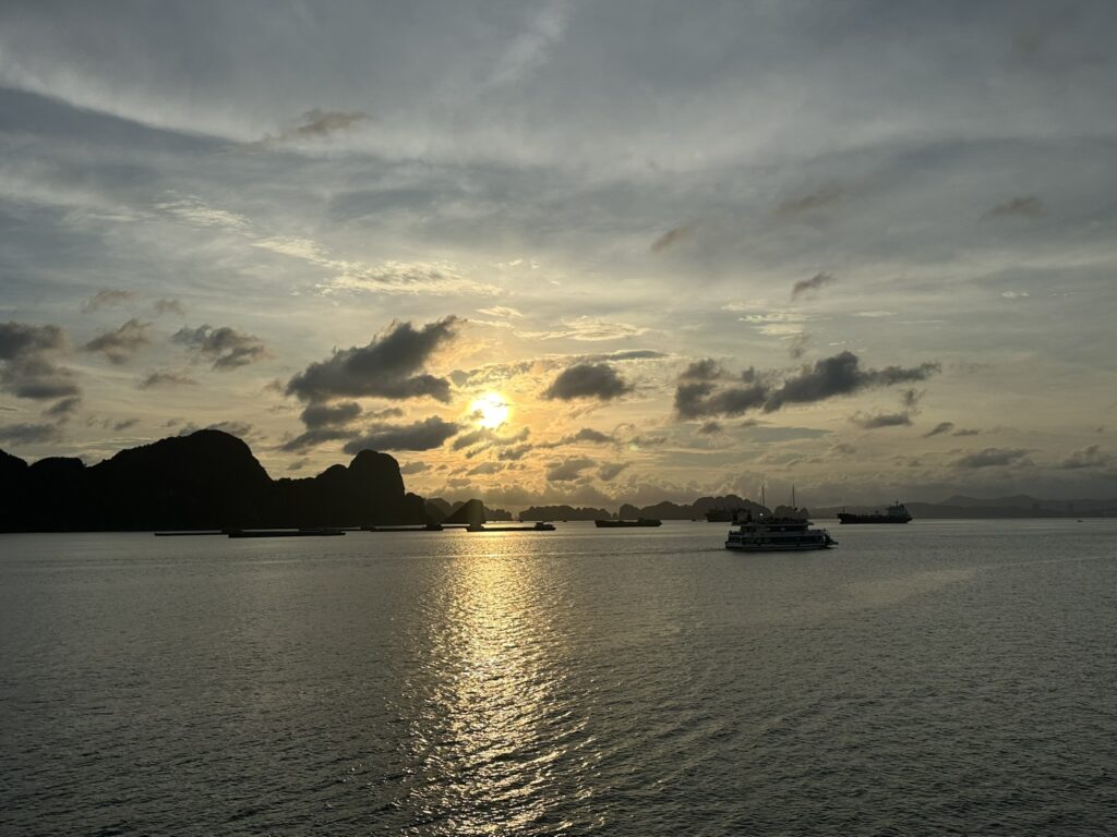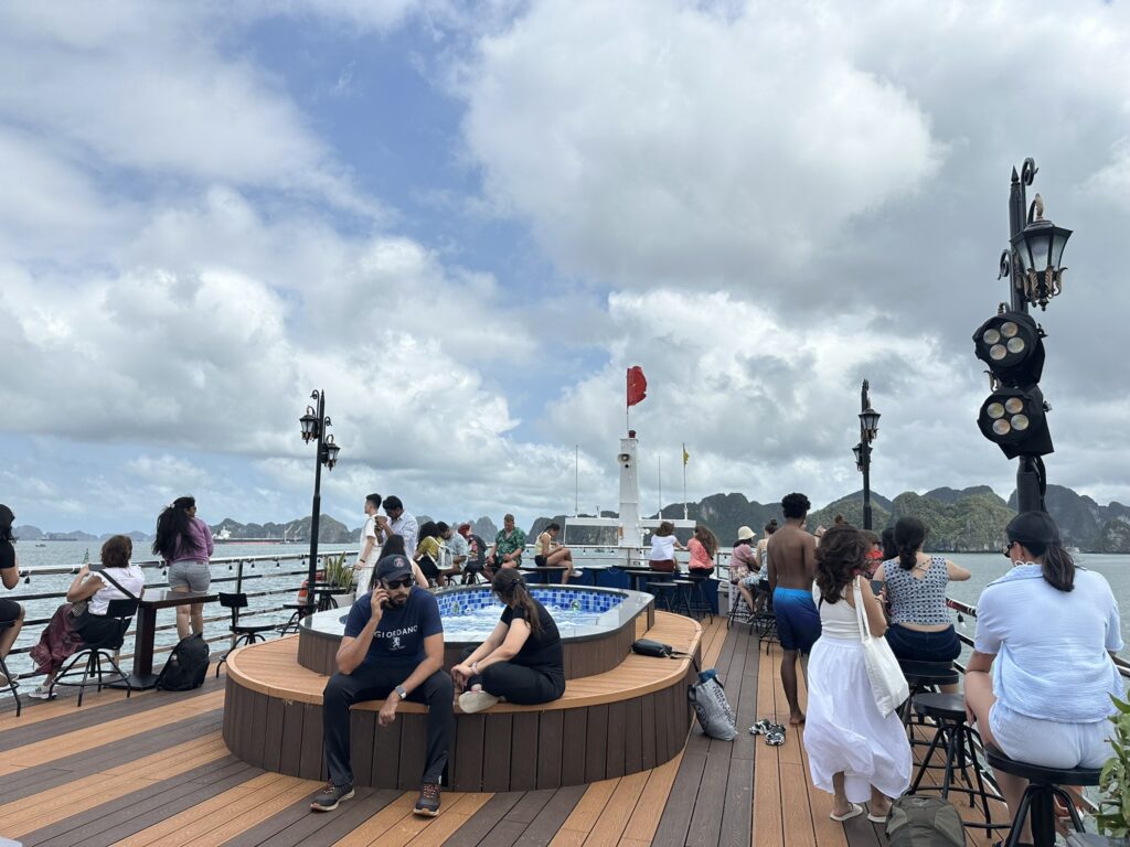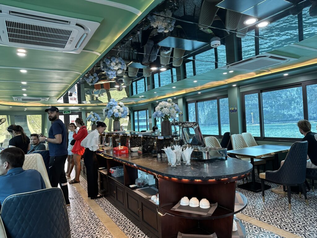 - バスでペットボトルの水が支給されますが、クルーズ船への持ち込みは禁止。水筒をもっていくか船内でドリンクを購入する必要があります。船内のドリンクは缶のコーラやスプライトで大体400円くらい〜でした。ベトナムの物価を考えると高いですが、クルーズ船にしてはリーズナブルかと。