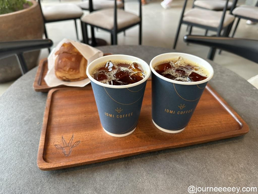サウジアラビアとドバイで人気のIDMI COFFEE ROASTERSにてコーヒーとパン。コーヒーが香り高くフルーティーでおいしかったです。