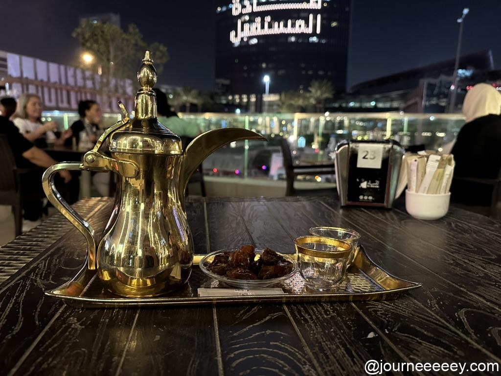 観光後はヒルトンのカフェでひと息。ここでもデーツと一緒に。サウジコーヒーのスパイスが効いた独特の味わいにどハマり中。