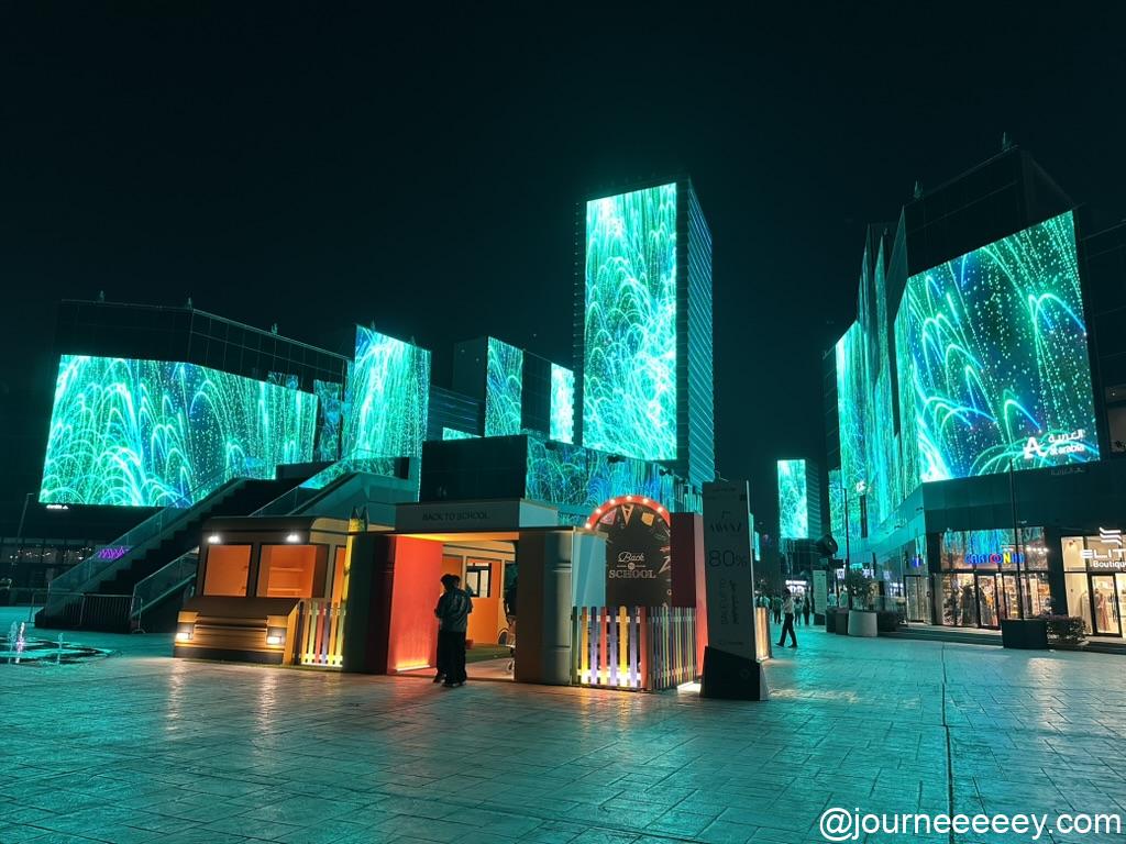 これでもかというほどに建物に噴水どこもかしこもキラキラ光るエンターテントエリア。若者があつまりナイトライフを楽しんでいました。ずらりと飲食店がならび、アトラクションもあります。