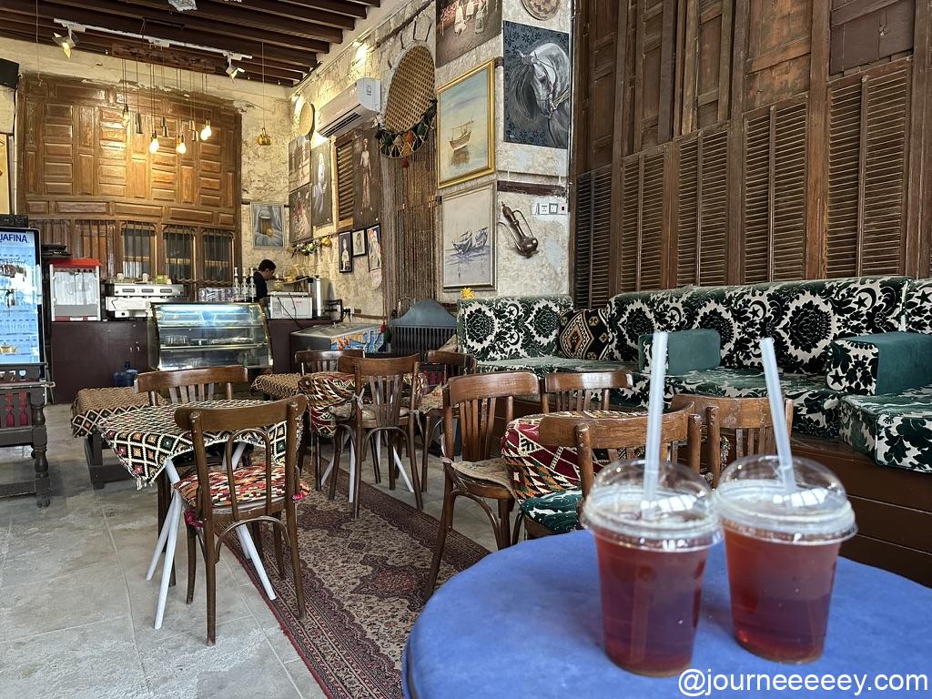 散策の合間に旧市街カフェでひとやすみ。伝統的な建物は内装もすてき。サウジの夏はとんでもなく暑いのですぐカフェで涼みたくなります。