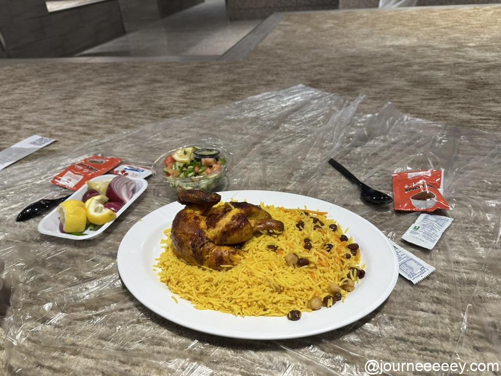 ローカル店で深夜ディナーにカブサ。サフランやスパイスで炊き込んだライスの上に、柔らかく煮込まれたほろほろなチキンが豪快にのっていてボリューム満点でした。地元の人に混じって床で食べるスタイルにちょっとテンション上がります。ちゃんとシートも敷かれてきれいを保つ工夫がされていました。