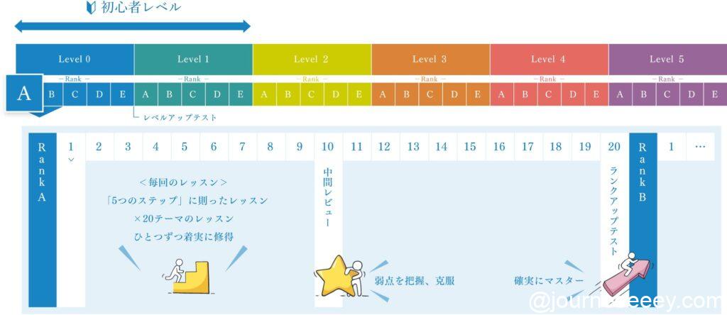 プログラムはLevel 0〜5 の6段階 × 各ランク A〜Eで最大30段階の細分化され、学習の細やかな進捗に対応されています。各Levelごとに想定される学習テーマや教材サンプルも公開されているため、自分の目標レベルに合わせた学習計画が立てやすくなっています。