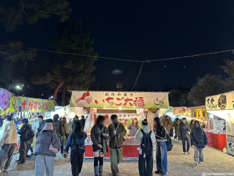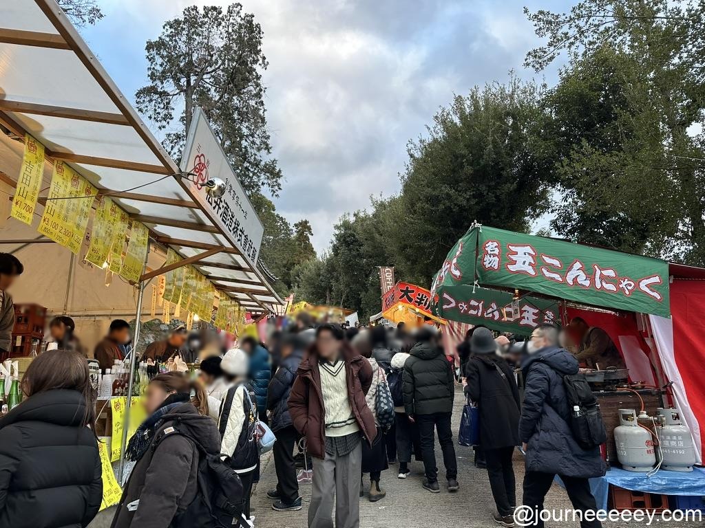 2月2日〜4日の3日間の開催で、特に2日・3日は約800店の屋台が立ち並ぶため、境内から周辺道路まで人で埋め尽くされるほどの大にぎわい。