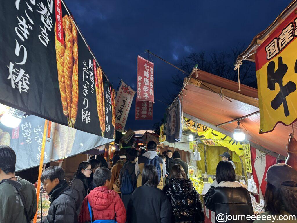 参道から境内周辺、東一条通あたりまで、約800軒の屋台がずらりと並びます。