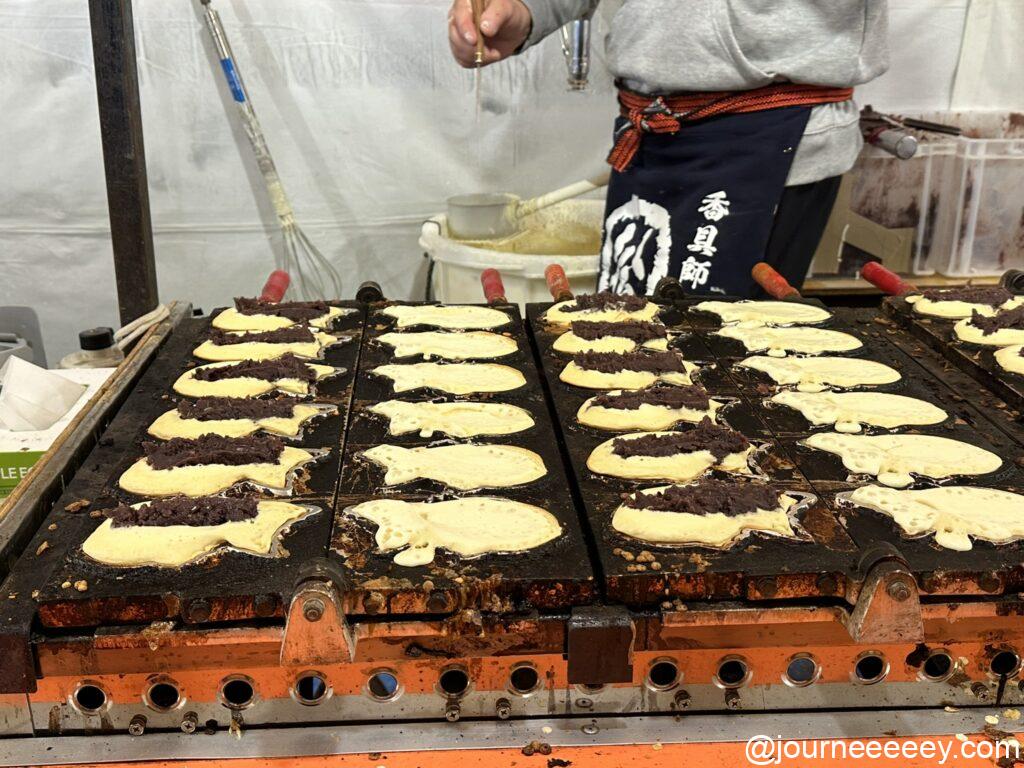 そして、吉田神社節分祭の屋台でしか買えない出町のたい焼き!屋台5軒分ほどの大きなスペースで構え行列ができる人気店です。京大の正門から近いところにあります。