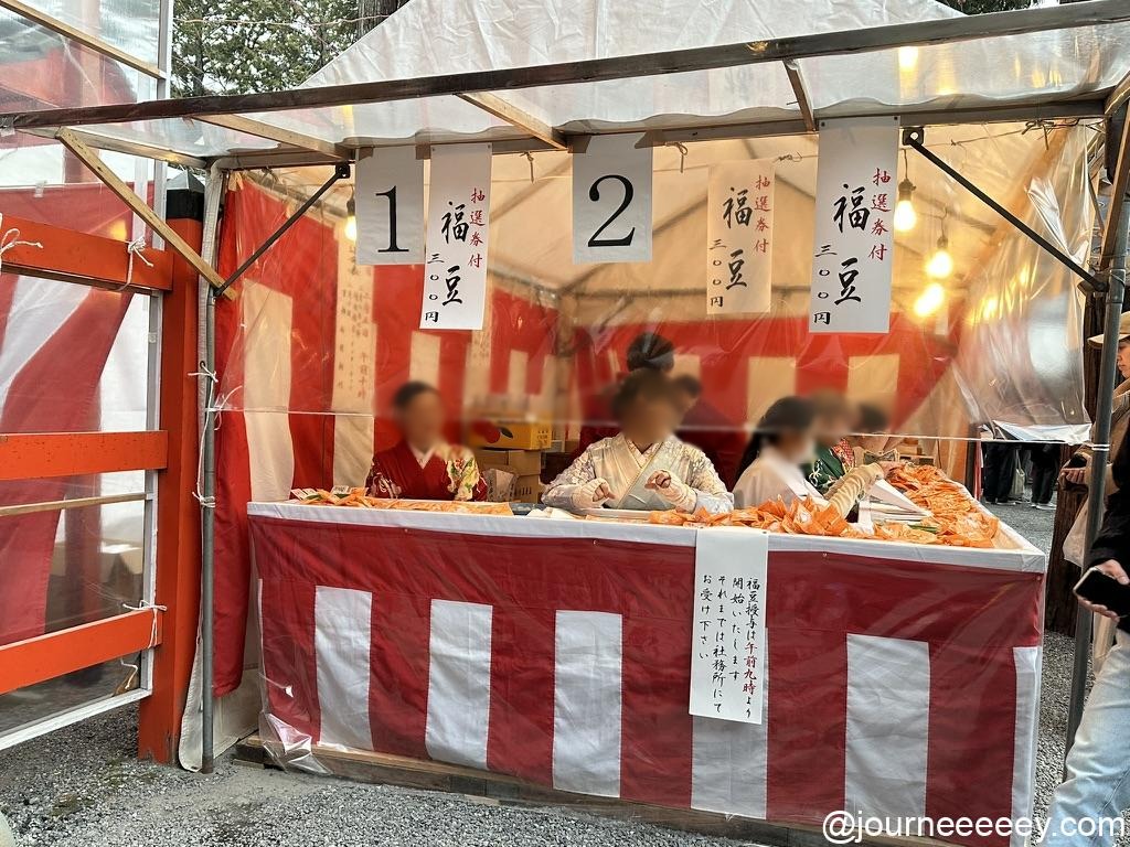 境内には福豆を売っているテントがいくつかあるので、意外とスムーズに買えます。運試しが300円で楽しめる!当たらなくても縁起物の福豆が持ち帰れるのがうれしい◎