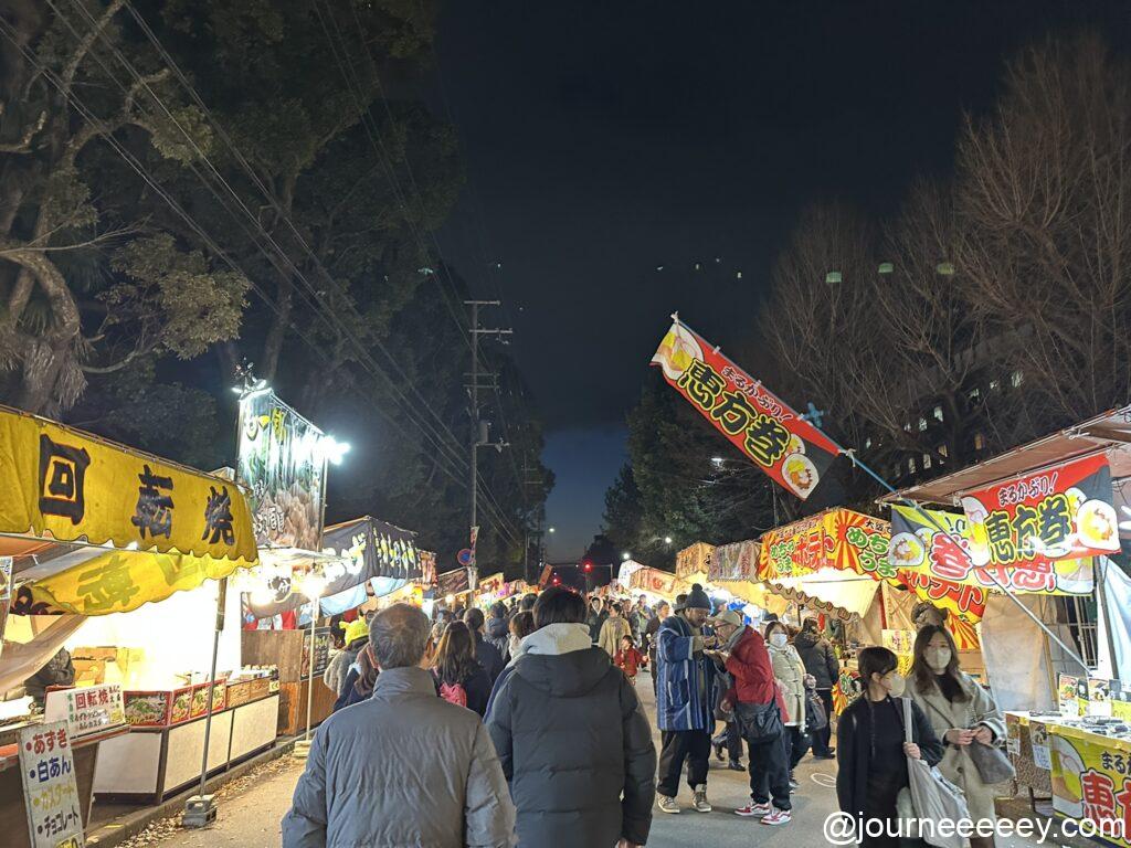 2月2日〜4日の3日間の開催で、特に2日・3日は約800店の屋台が立ち並ぶため、境内から周辺道路まで人で埋め尽くされるほどの大にぎわい。