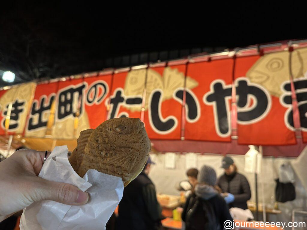 そして、吉田神社節分祭の屋台でしか買えない出町のたい焼き!屋台5軒分ほどの大きなスペースで構え行列ができる人気店です。京大の正門から近いところにあります。