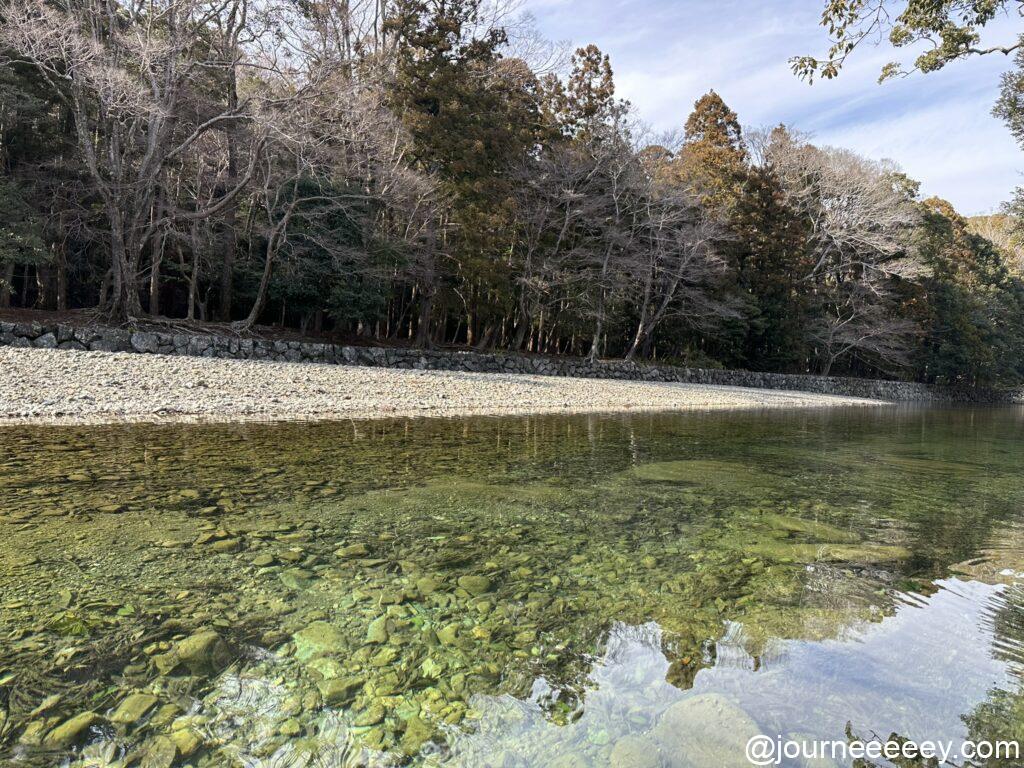 橋の下を流れる五十鈴川はとてもうつくしく、伊勢神宮の象徴的な景色のひとつ。