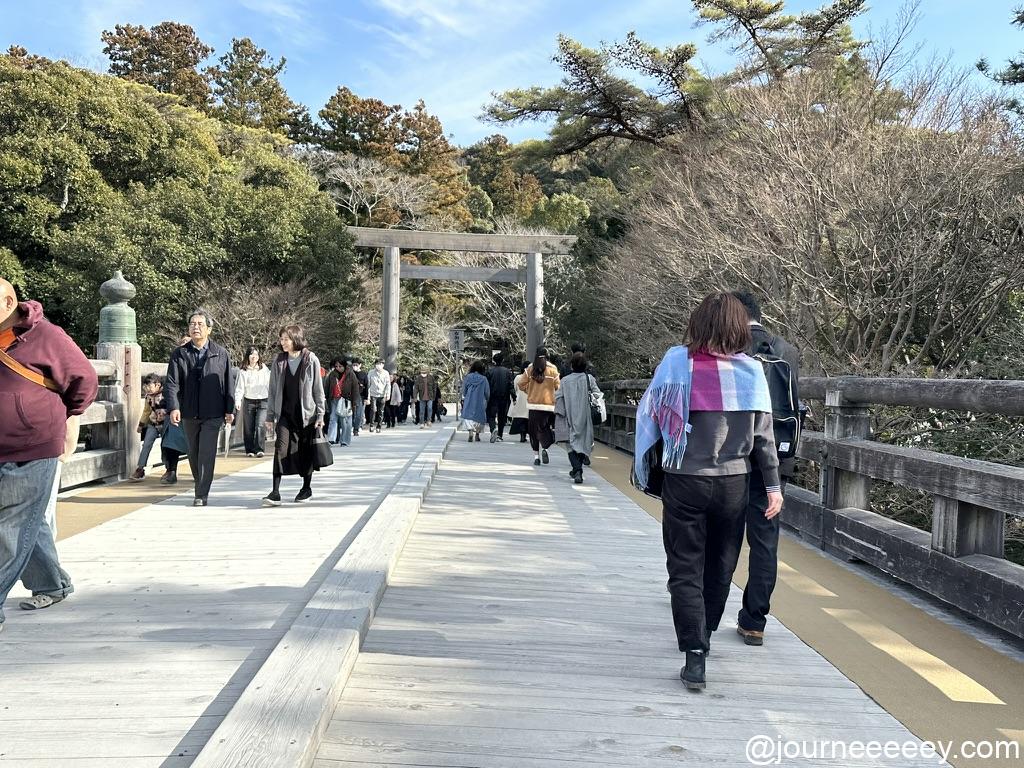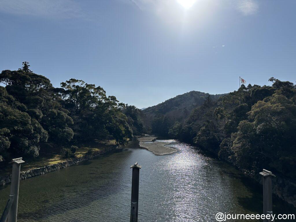 橋の下を流れる五十鈴川はとてもうつくしく、伊勢神宮の象徴的な景色のひとつ。