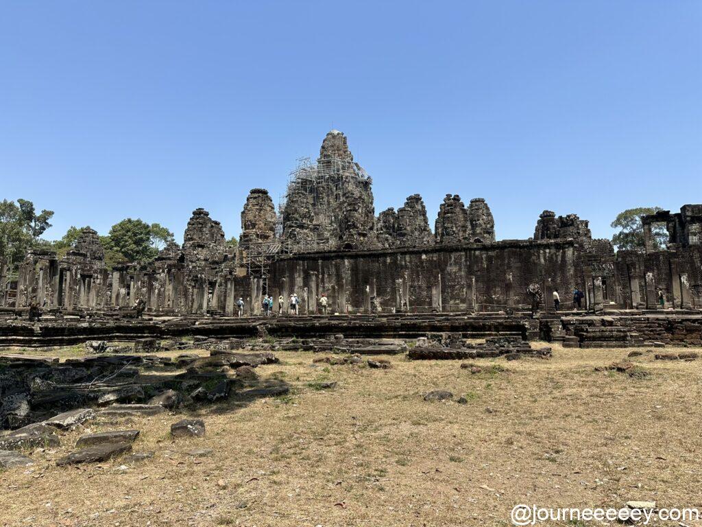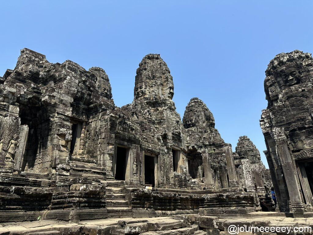 アンコール・トム(大きな都)の中心に位置する寺院で、ここの最大の見どころは200以上の顔の彫刻。四方を向いた大きな顔が、いたるところに刻まれています。