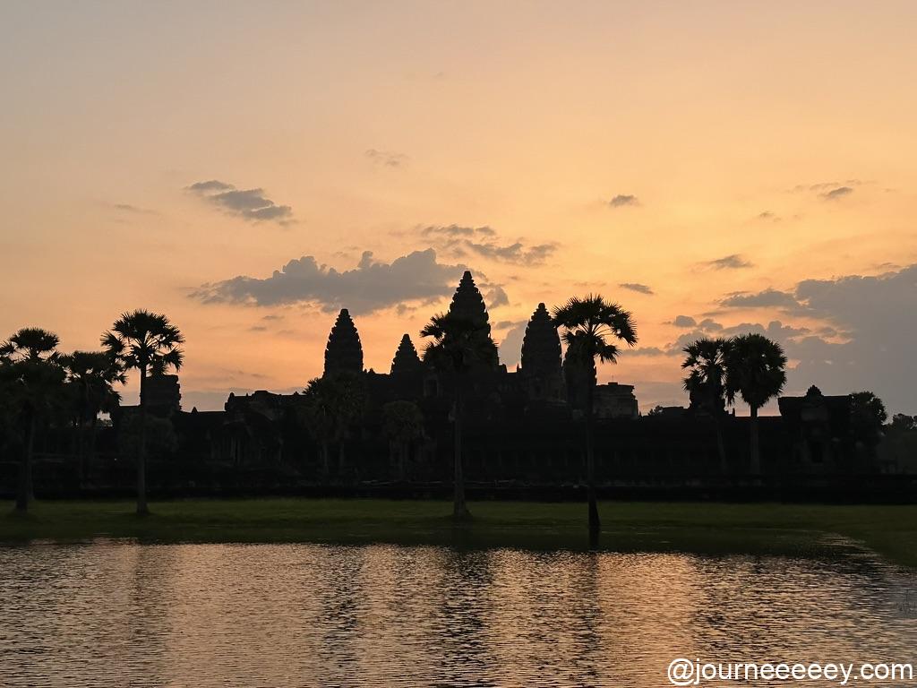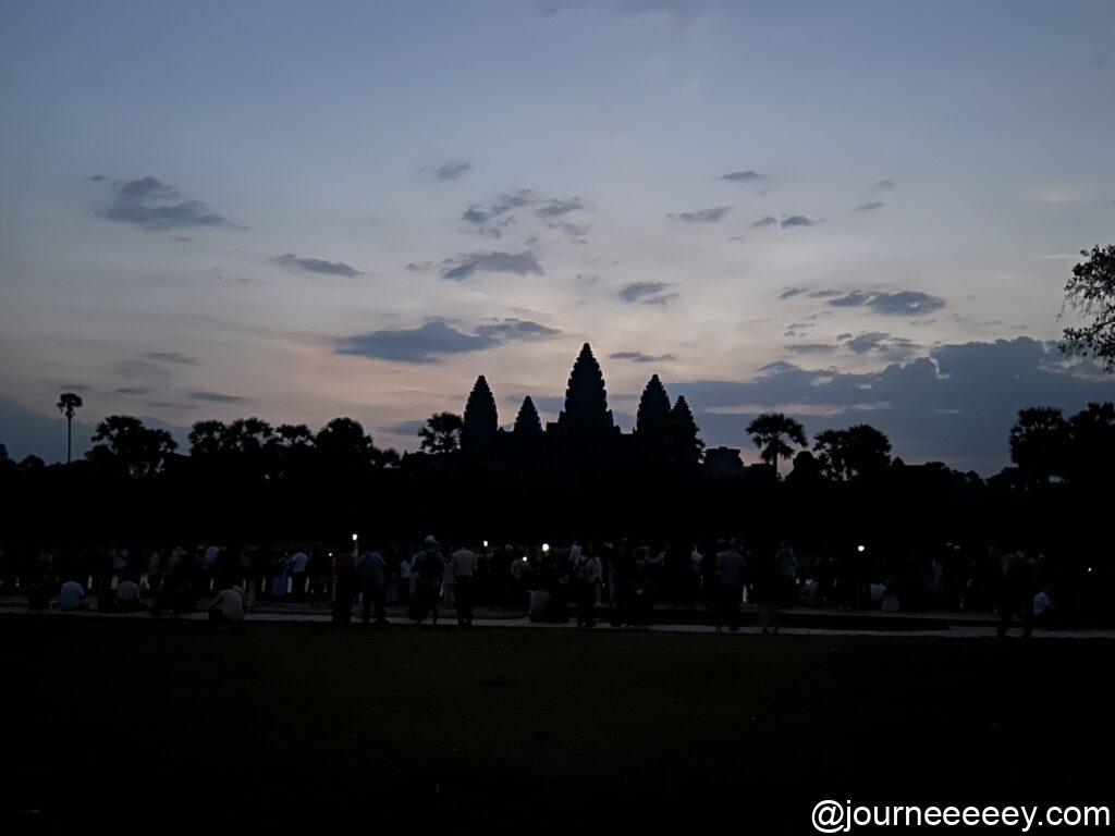 まだ辺りが暗いうちから人が集まりはじめ、池の前に陣取って日の出を待ちます。 東の空が少しずつ明るくなり、オレンジ色に染まりながら、アンコールワットのシルエットが浮かび上がってくる。