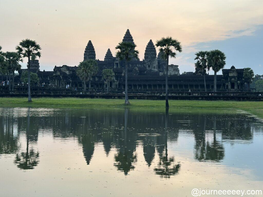日の出の時間は時期によって異なります(6:00〜6:30ごろが目安)。日が昇りきったころ、水面に映るアンコールワットの逆さまのリフレクションが見られました。